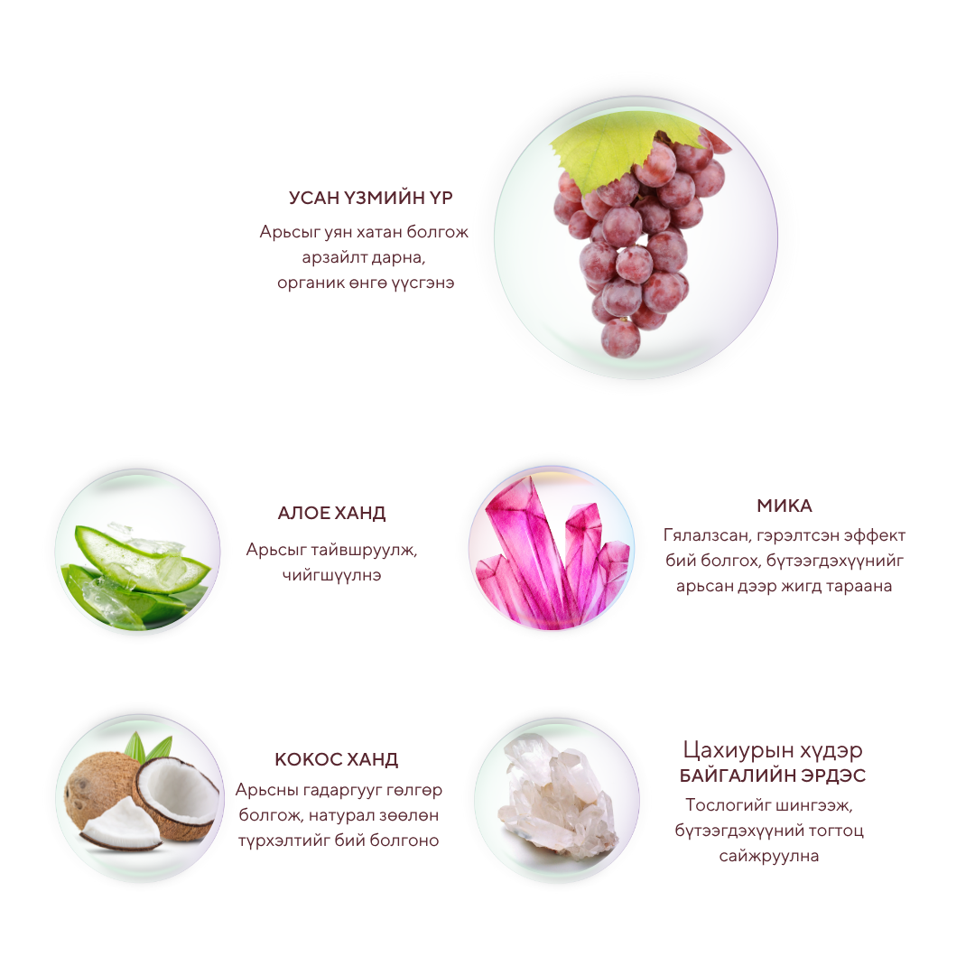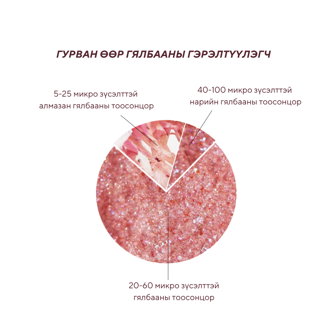 Үрчлээ багасгаж арьсыг залуулаг эрүүл гялалзсан харагдуулна. Гоёлын болон энгийн нүүр будалтад зориулсан 3 төрлийн өнгөтэй