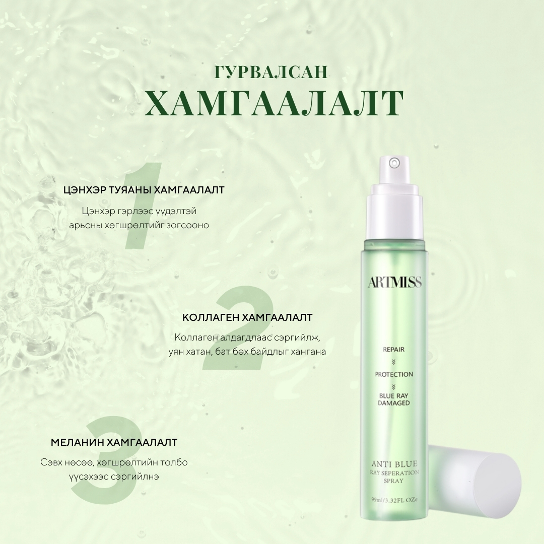 Утас, компьютер, зурагт, гэрэл зэрэг дэлгэцийн цэнхэр хорт туяанаас хамгаалах бүрхүүл үүсгэж, арьс өнгөө алдаж, гундаж хөгшрөх үйл явцыг зогсооно