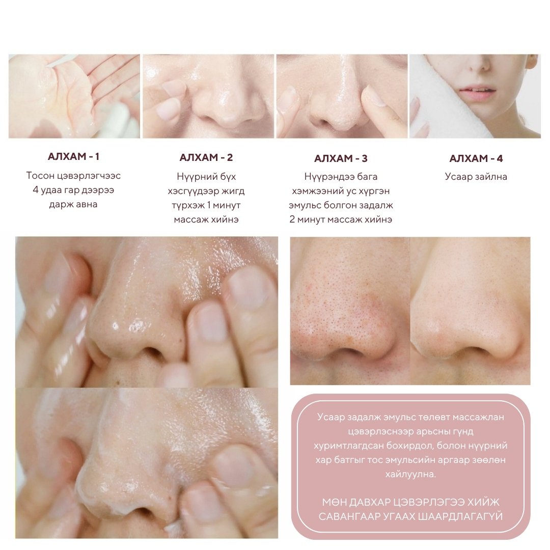 Будаг, нарны тос, арьсны тослог, үхэжсэн эд эсийн үлдэгдэл гэх мэт арьсны нүх сүвэнд байж болох бүх бохирдлыг хайлуулан цэвэрлэж, арьсны өнгө цайруулж чийгшүүлнэ