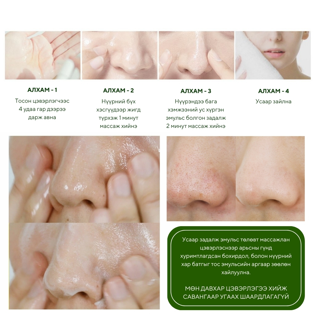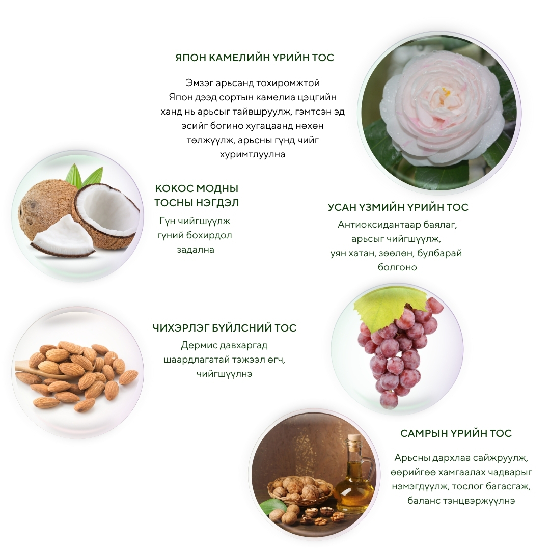 Будаг, нарны тос, арьсны тослог, үхэжсэн эд эсийн үлдэгдэл гэх мэт арьсны нүх сүвэнд байж болох бүх бохирдлыг хайлуулан цэвэрлэж, арьсны эмзэгшил багасгаж чийгшүүлнэ