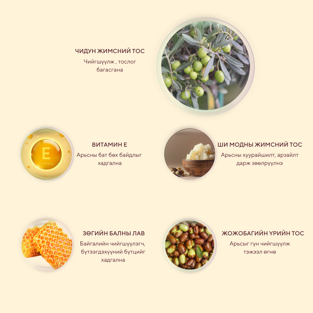 Бүх төрлийн өө сэвийг бүрэн дардаг, удаан эдэлгээтэй чийгшүүлэгчтэй шахмал крем