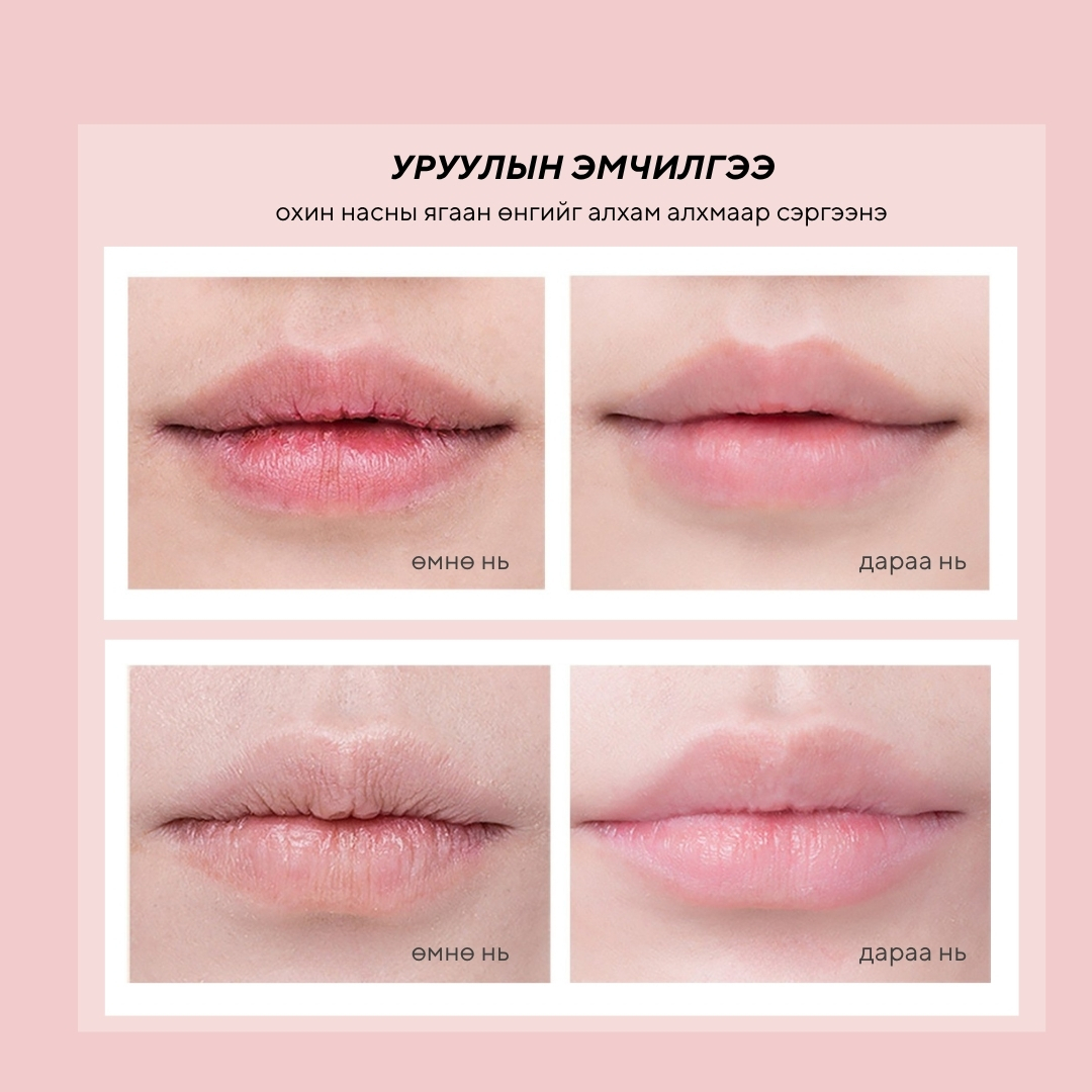 Уруулын үрчлээ тэнийлгэж, урт хугацаанд чийгшил тэжээлээр хангаж, булбарай зөөлөн болгож, уруулын хатсан, хагарсан, хомхой зэрэг өвчнийг эдгээнэ
