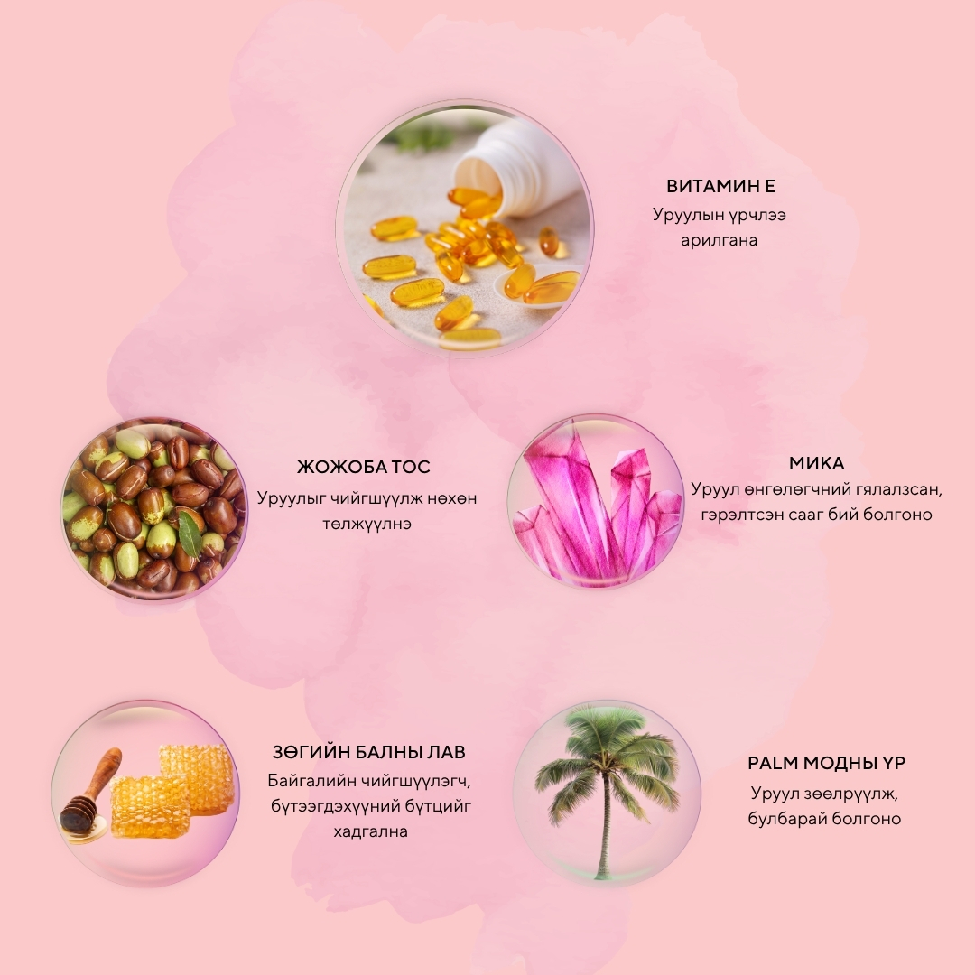 Нарийн ширхэгтэй саа нь од мэт гялалзаж уруулыг үрчлээгүй, том, бумбагар харагдуулна.