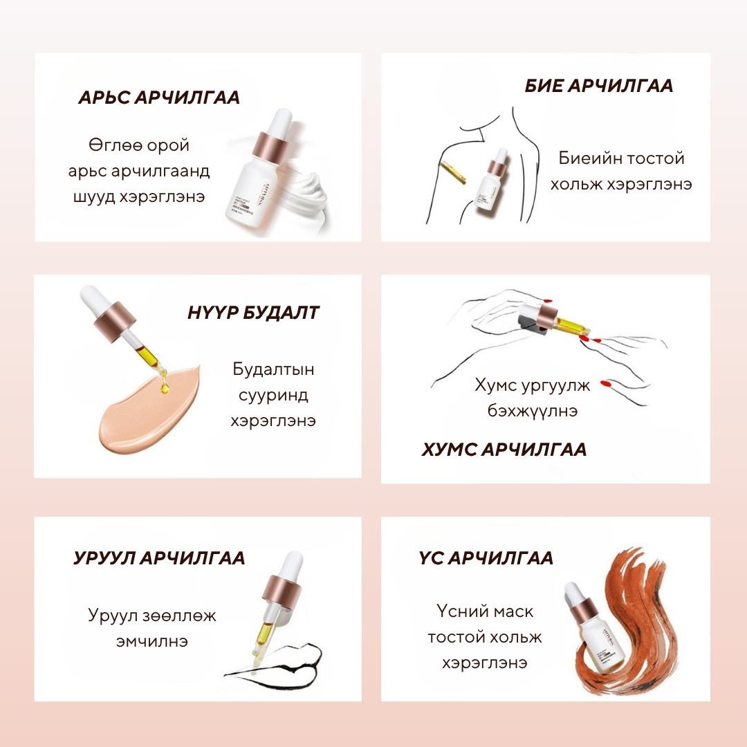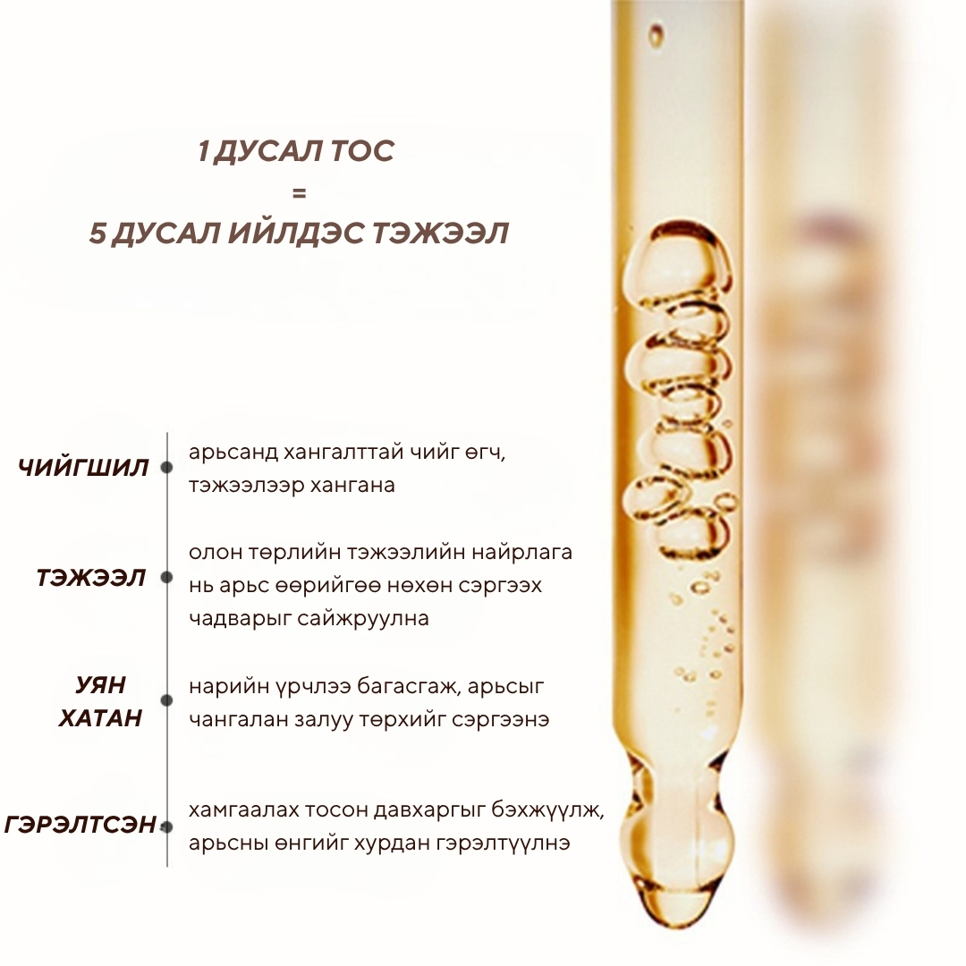 Олон төрлийн ургамлын цэвэр охь нь арьсны бүх төрлийн асуудлыг эмчилж, дээд зэргийн чийг тэжээлийг жинхэнэ давхарга хүртэл нэвтрүүлнэ