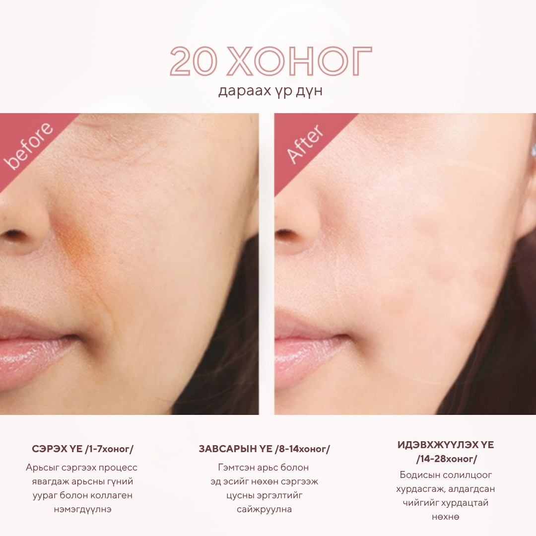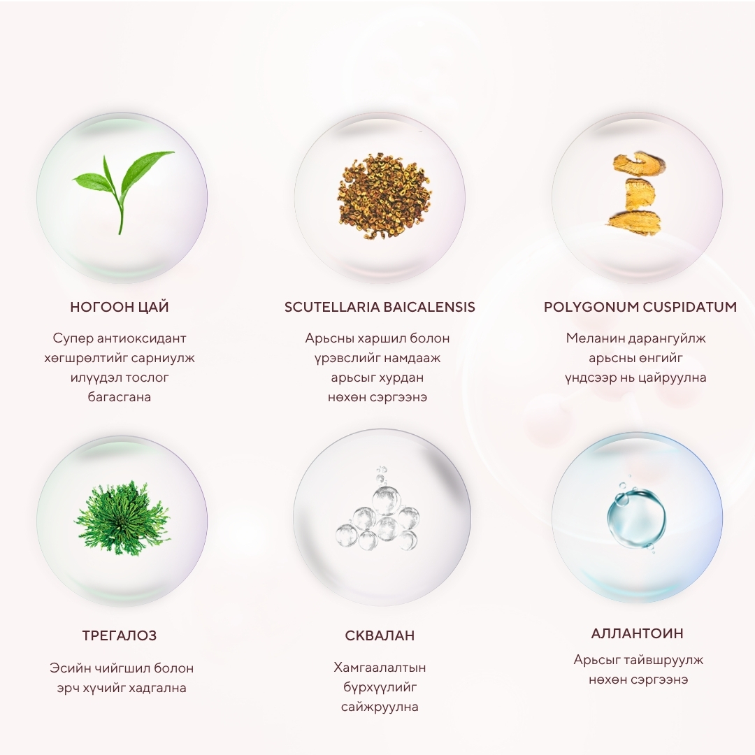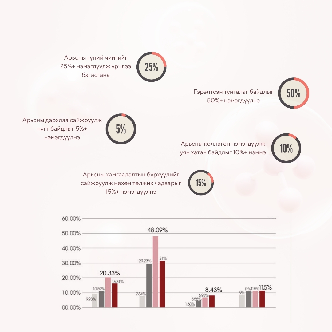 Бүх төрлийн арьсанд тохиромжтой 50% Арьсны өнгө сэргээж гэрэлтсэн тунгалаг болгоно 25% Гүний чийгийг нэмэгдүүлнэ 30% Арьсны дархлаа сайжруулж, нөхөн төлжилт хурдасгана 15% Үрчлээ тэнийлгэнэ 10% Арьсны уян хатан чанарыг нэмэгдүүлнэ 5% Арьсны нягтаршил сайжруулна