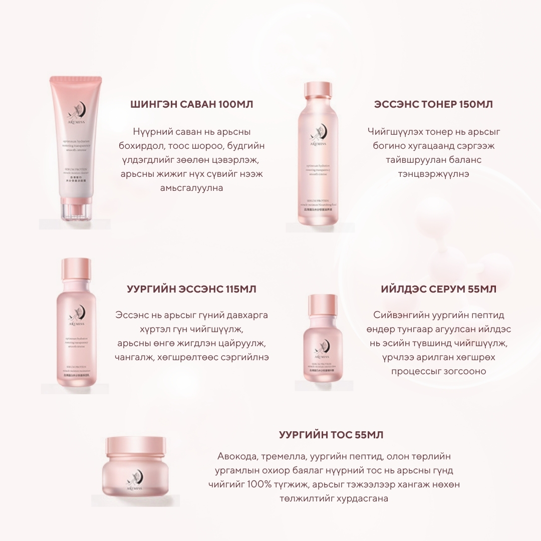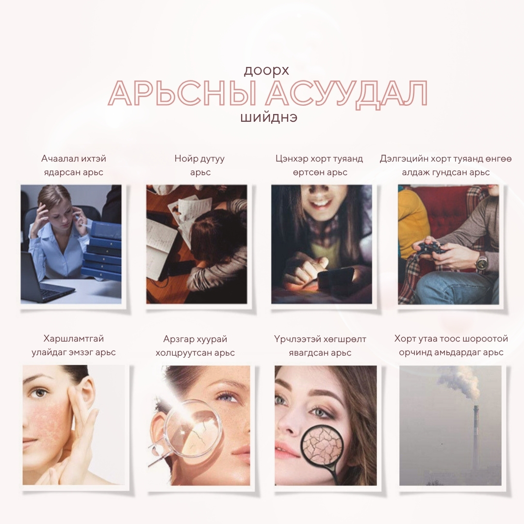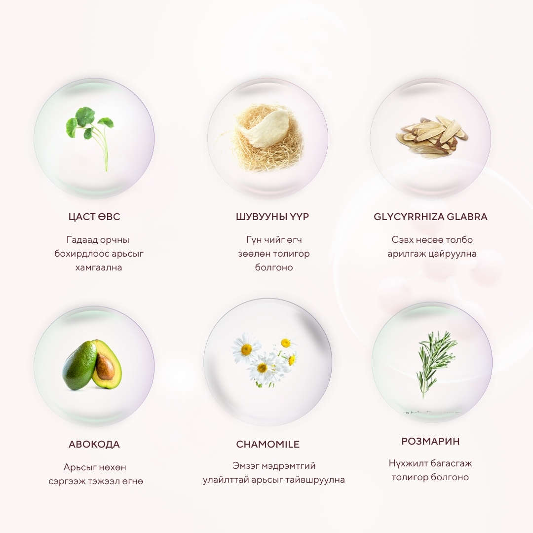 Бүх төрлийн арьсанд тохиромжтой 50% Арьсны өнгө сэргээж гэрэлтсэн тунгалаг болгоно 25% Гүний чийгийг нэмэгдүүлнэ 30% Арьсны дархлаа сайжруулж, нөхөн төлжилт хурдасгана 15% Үрчлээ тэнийлгэнэ 10% Арьсны уян хатан чанарыг нэмэгдүүлнэ 5% Арьсны нягтаршил сайжруулна