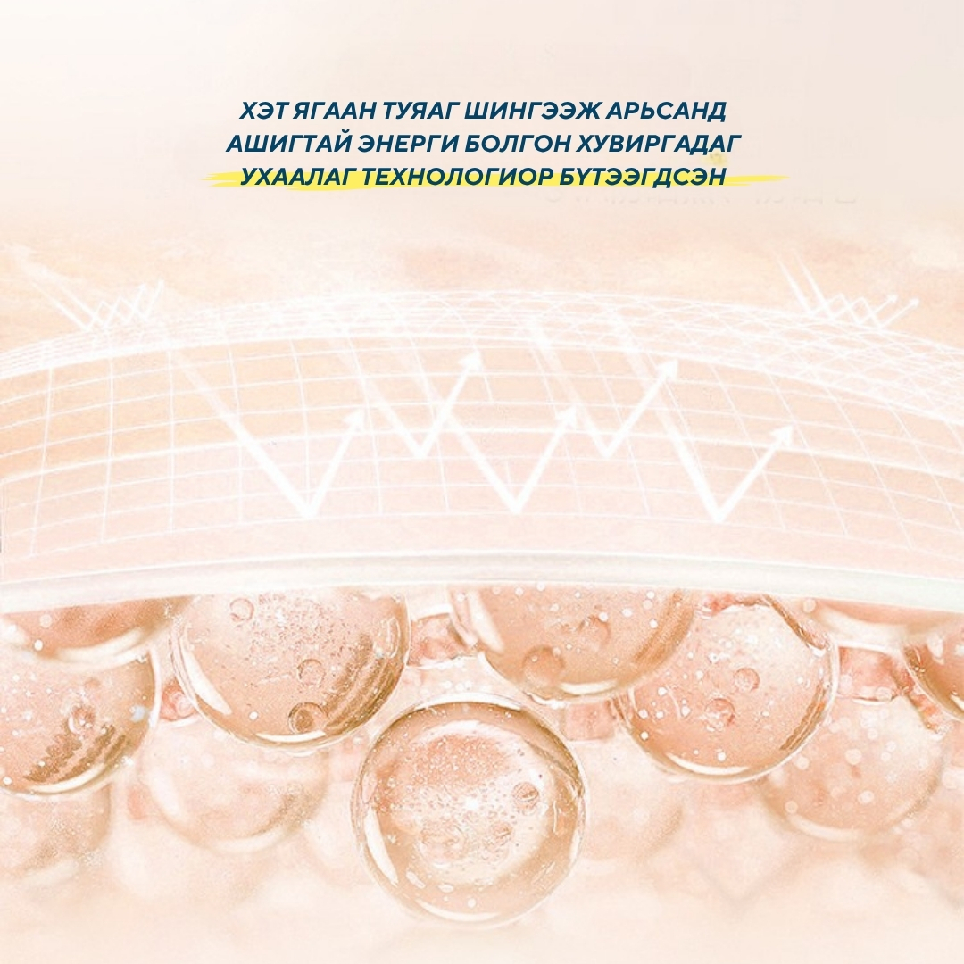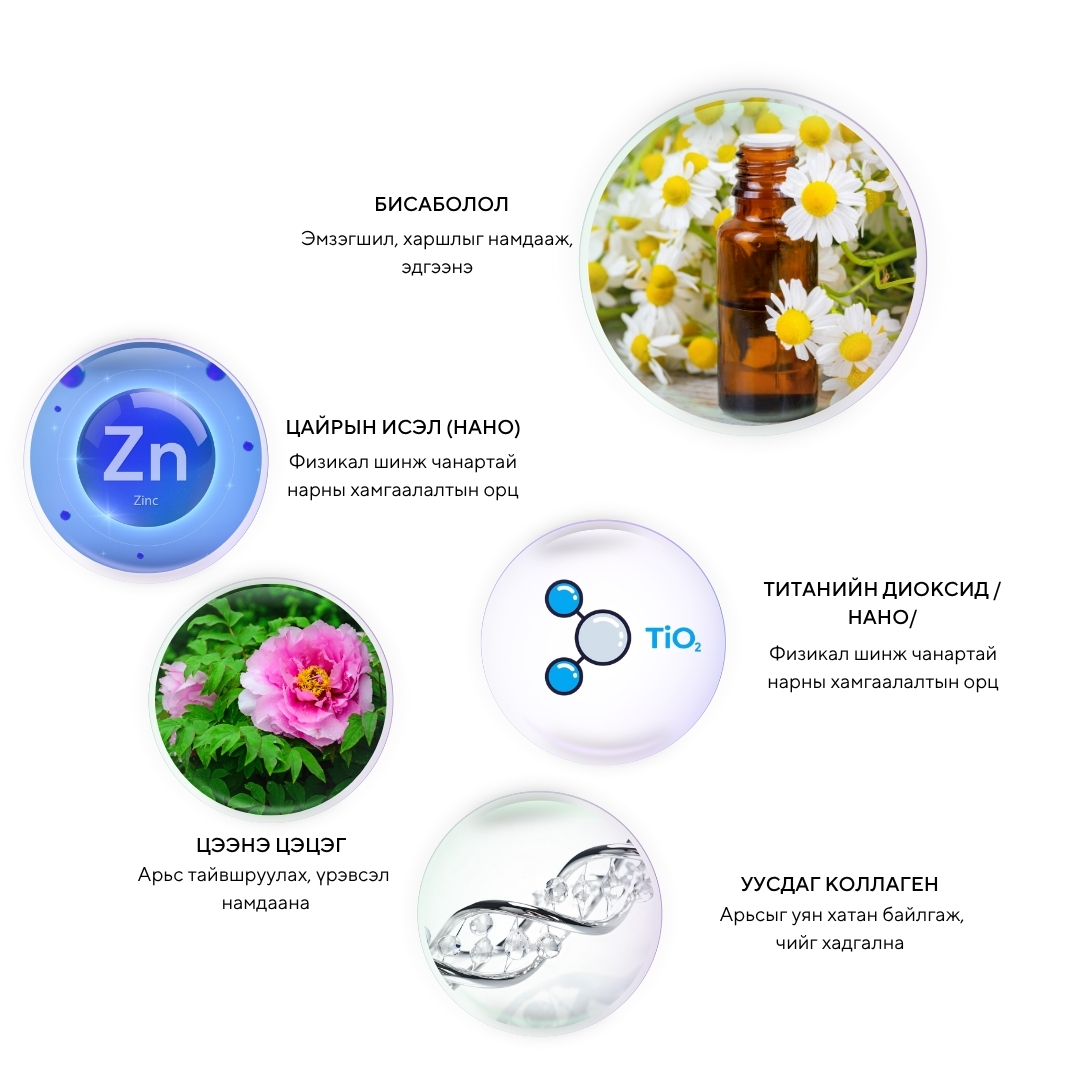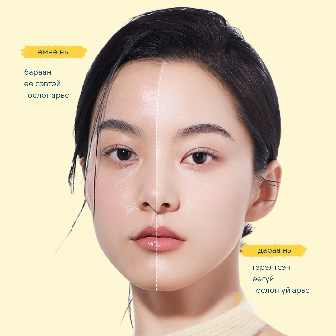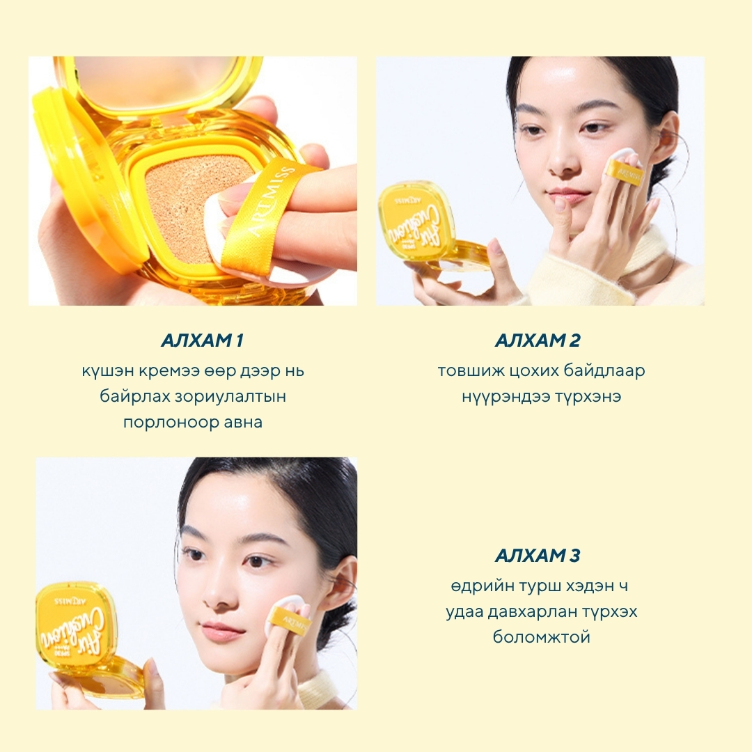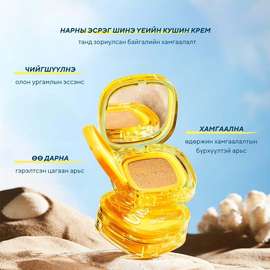 Күшн хэлбэртэй нарны тос нь өө дарж, арьс чийгшүүлэн нарнаас хамгаална. Арьсны өнгөөр хувирах ба өөрөө солих запас дагалдана. SPF 45 PA+++ UVB UVA туяанаас хамгаална.